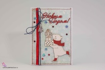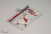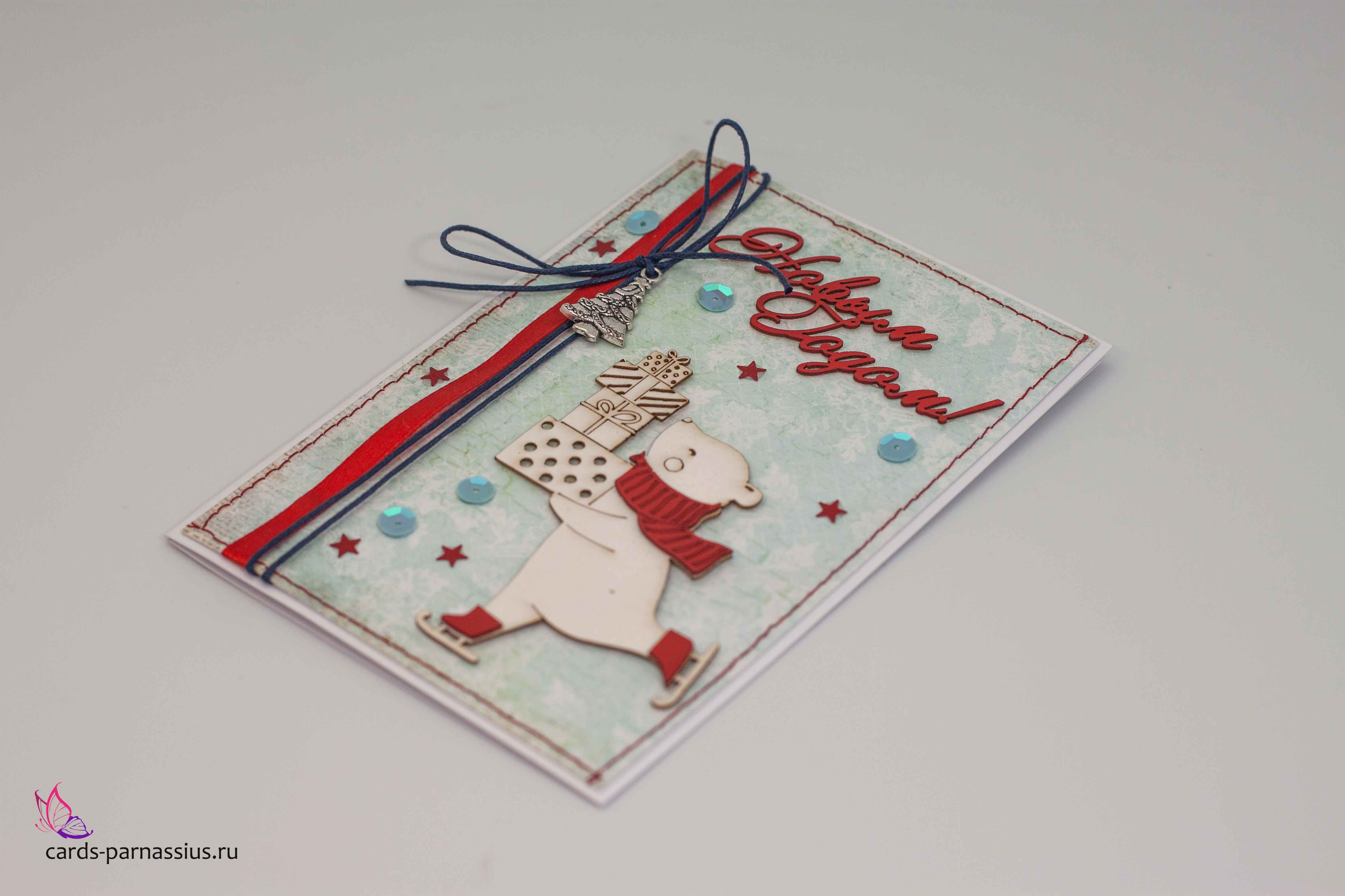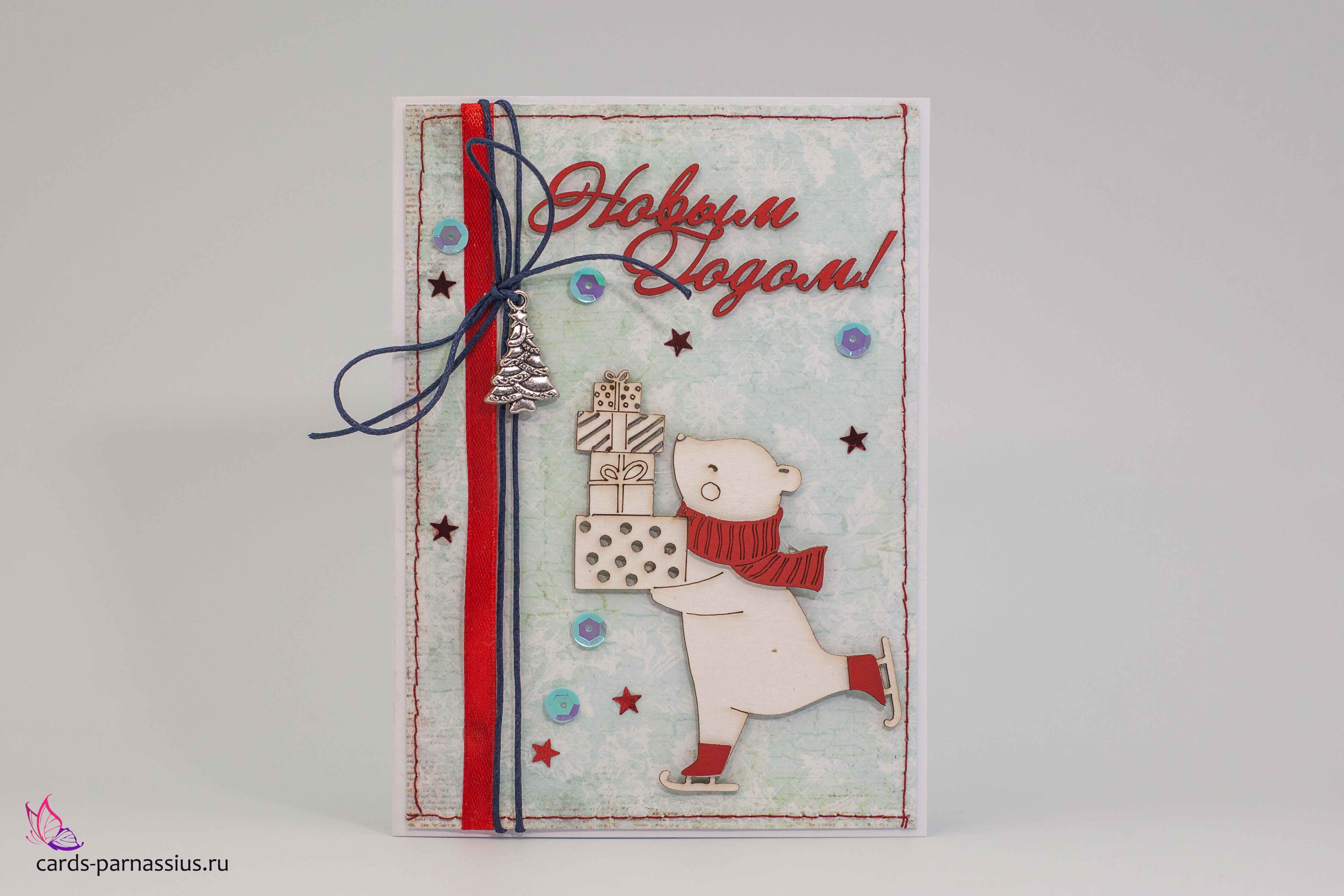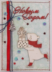 М273 Открытка ручной работы 10х15 см - Миша на коньках