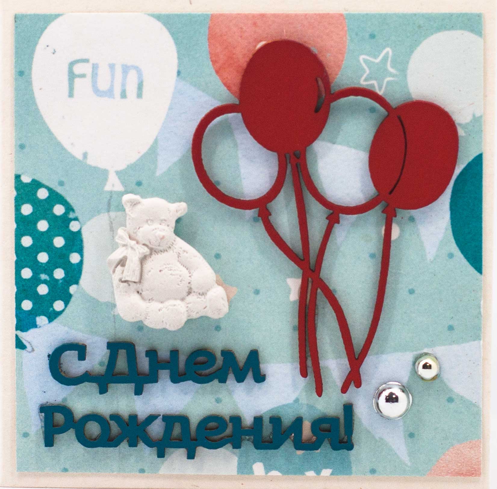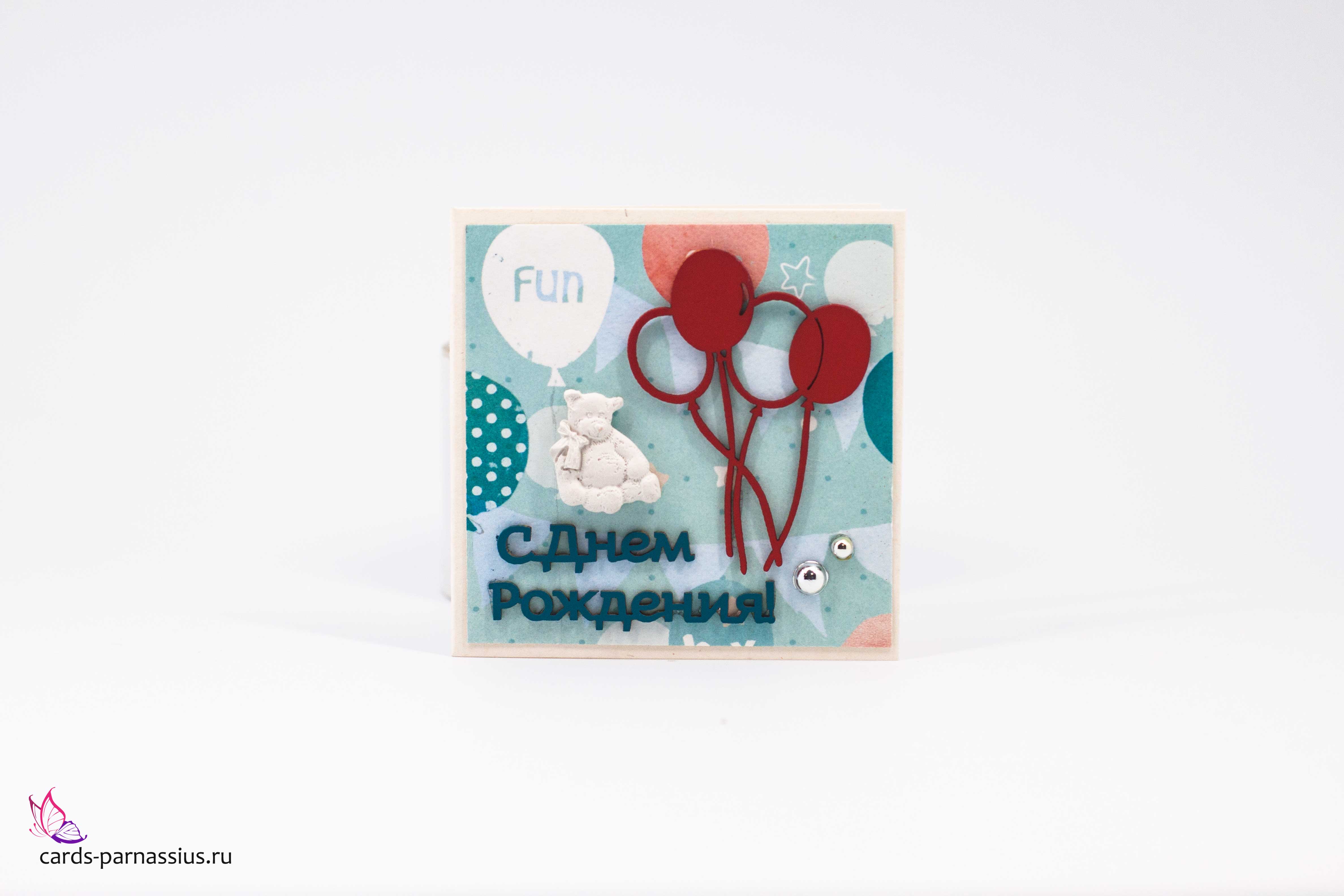 Т084 Открытка ручной работы 8х8 см (Букетная) - Мишка с шариками